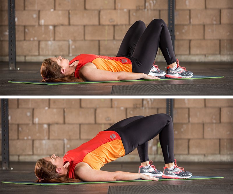 down by your sides. Press firmly through your feet and engage your glutes to lift up the