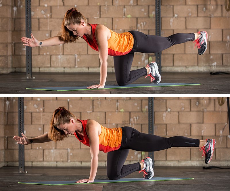 reach the top position with the arm and leg extended, move both limbs a few inches